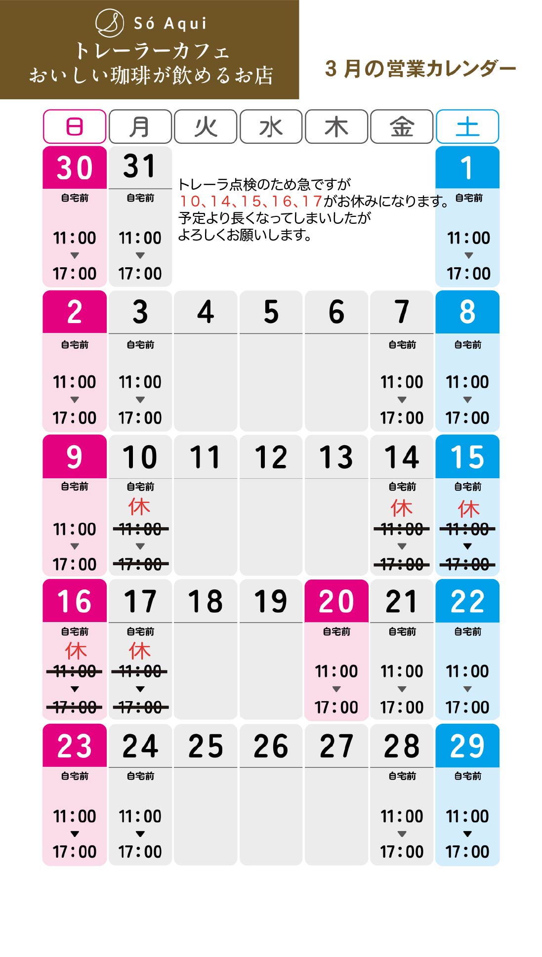トレーラ点検のため、急遽お休みの連絡をしましたが重ねて営業予定が変更となりましたので、再度お知らせします。