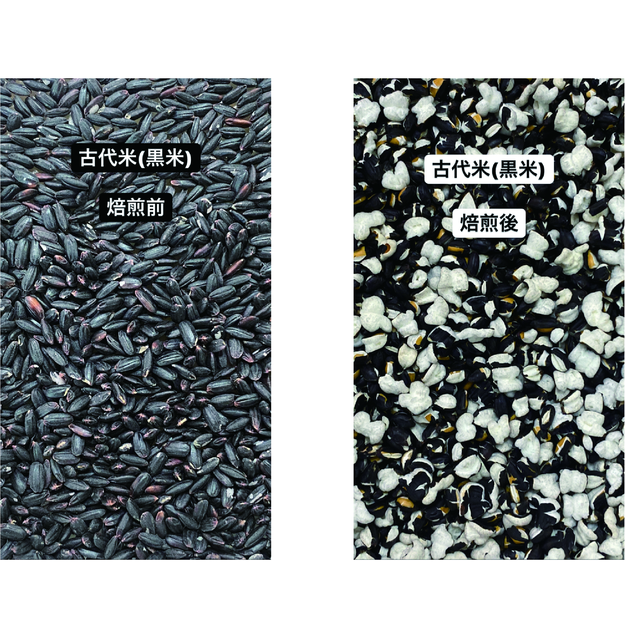 焙煎後は少し弾けるお米もあるので白と黒が混ざった形です。