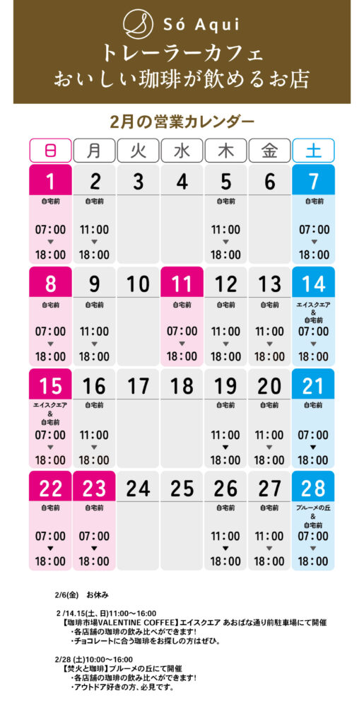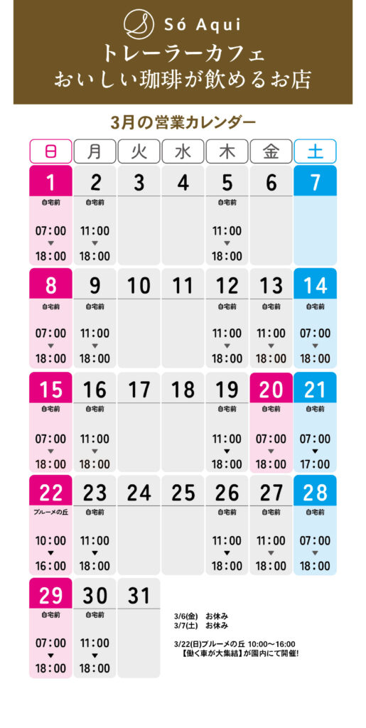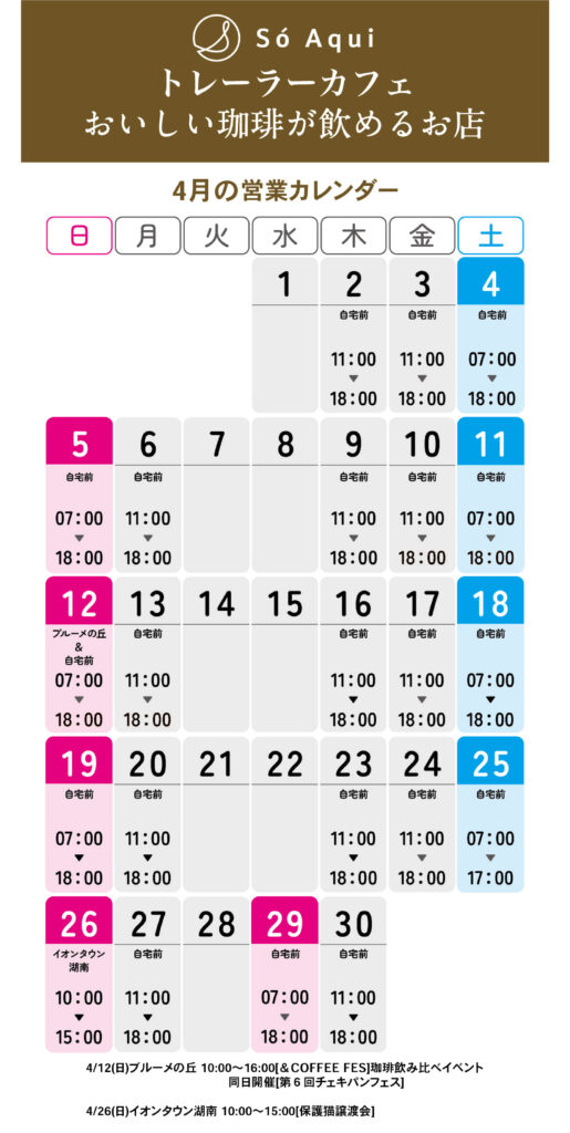 営業カレンダーに自宅前と記載している日は上記場所で営業しています。